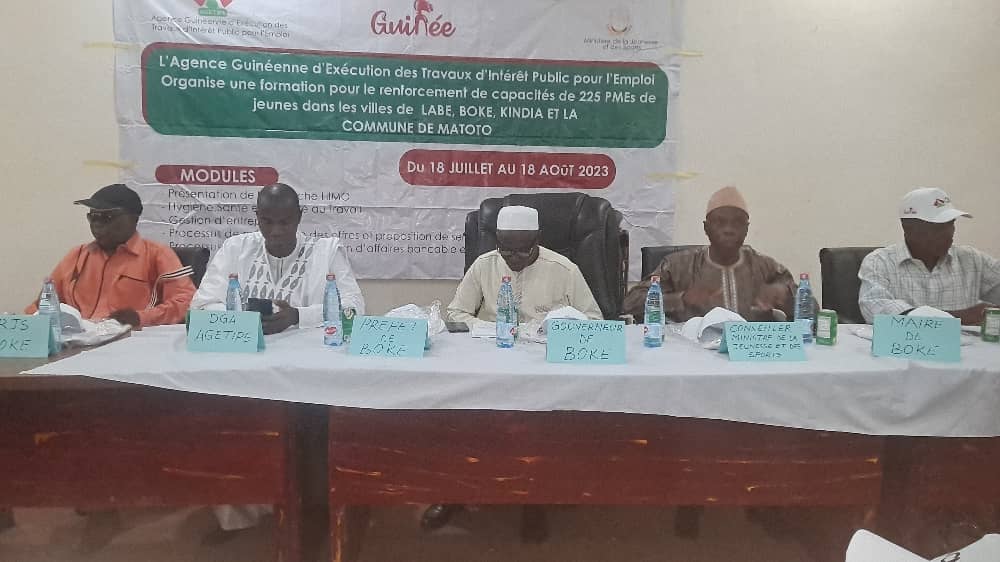 Après les étapes de Labé et Kindia, l’Agence Guinéenne d’Exécution des Travaux d’Intérêt Public pour l’Emploi (AGETIPE), Sous la tutelle du Ministère de la Jeunesse et des Sports, a officiellement lancé ce mardi, 1er août 2023, les travaux de la 2ème phase du << Projet de renforcement de capacités de 450 PMEs de Jeunes dans la région administrative de Boké.