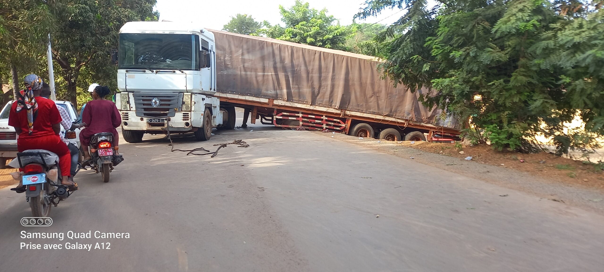Dans la soirée du mercredi, 7 juin 2023, un camion remorque immatriculé RC- 3478 S, transportany des +marchandises et plusieurs objets de valeur a failli se renverser avant de bloquer ka route verticalement sur la pente de Boubou relevant du quartier Lambanyi dans la commune urbaine de Boké.
