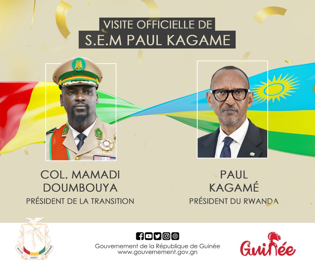 1. A l’invitation de Son Frère et Ami, Son Excellence Colonel Mamadi DOUMBOUYA, Président de la Transition, Président du CNRD, Chef de l’Etat, Chef Suprême des Armées, Son Excellence Monsieur Paul KAGAME, Président de la République du Rwanda, à la tête d’une importante délégation, a effectué une visite d’Amitié et de Travail à Conakry du 17 au 18 avril 2023.