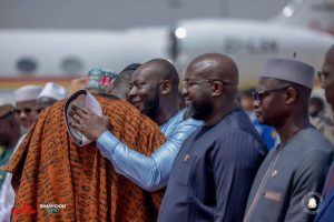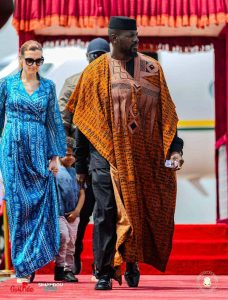 À sa descente d’avion, le Président a été accueilli par la Première Dame, Madame Lauriane Doumbouya. Elle était accompagnée du Premier ministre, Amadou Oury Bah, du Ministre Secrétaire Général de la Présidence, Amara Camara, ainsi que du Ministre Directeur de Cabinet de la Présidence, Djiba Diakité.
