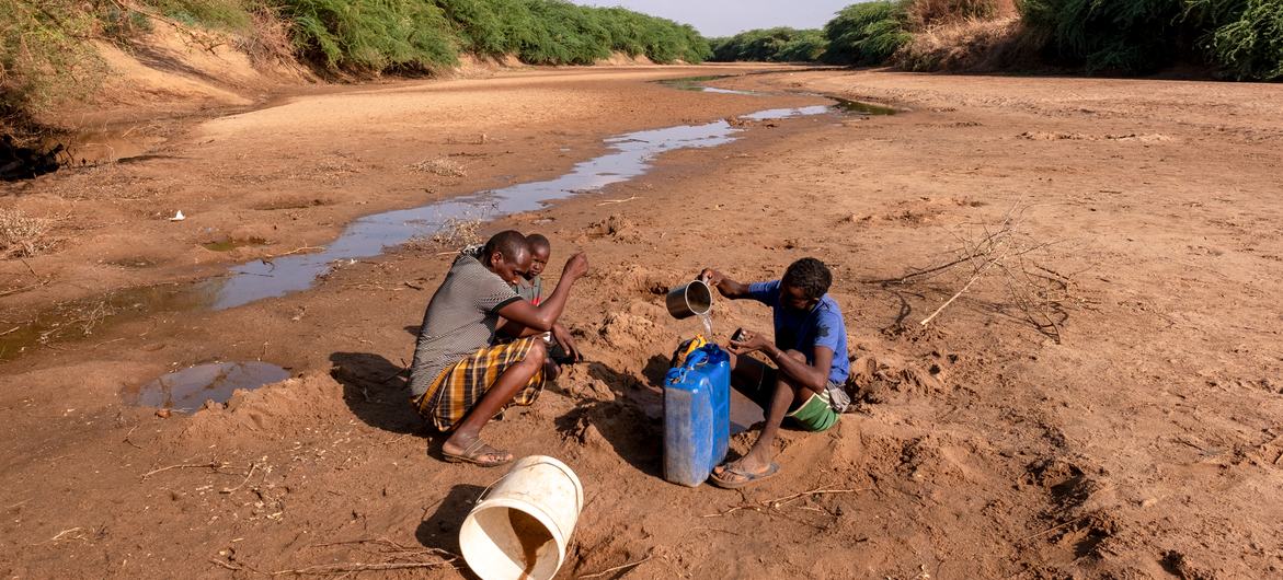 Un homme avec ses enfants collecte de l’eau de la rivière asséchée Dollow, en Somalie.