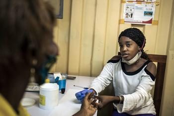 Une conseillère effectue un test rapide de VIH dans un poste de distribution de traitements pour patients stables de la commune de Lingwala à Kinshasa
