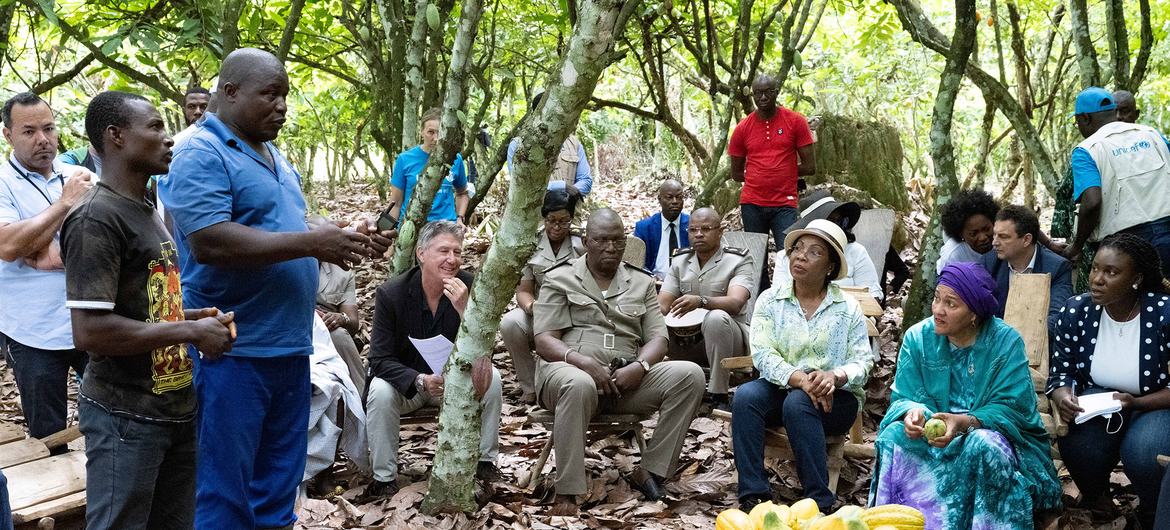 Amina Mohammed a pu visiter une plantation de cacao appliquant des techniques d’agroforesterie. Elle a félicité les autorités pour cette initiative car « il est essentiel pour un pays comme la Côte d’Ivoire qui a perdu près de 80% de son couvert forestier de s’engager dans la foresterie. L’agroforesterie permet aux paysans de diversifier leurs productions, de reboiser les terres agricoles, donc de lutter contre le réchauffement climatique et d’apporter de nouveaux moyens de subsistance. La régénération des plantations est essentielle à la pérennité de la filière cacao ».