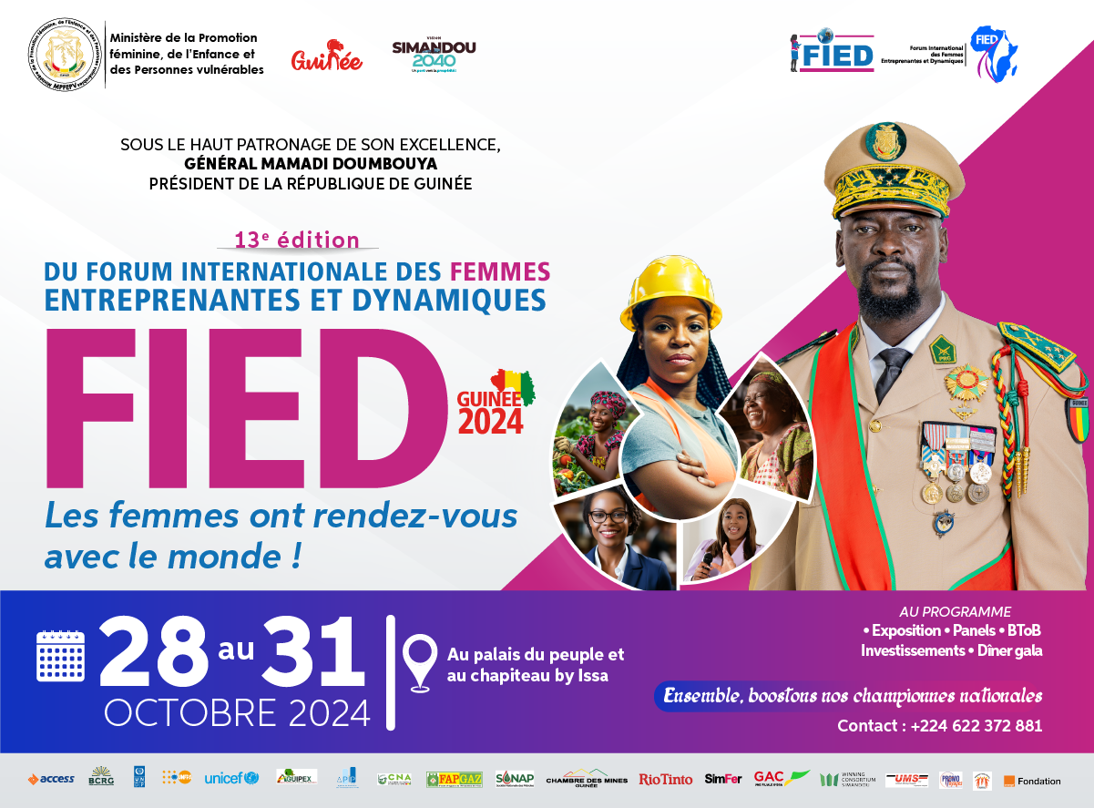 La République de Guinée accueillera, du 28 au 31 octobre 2024, la 13e édition du Forum International des Femmes Entreprenantes et Dynamiques (FIED). Cet événement majeur mettra en avant le rôle essentiel des femmes dans l’économie mondiale, en réunissant entrepreneures et leaders influents venus d’Afrique et d’ailleurs.
