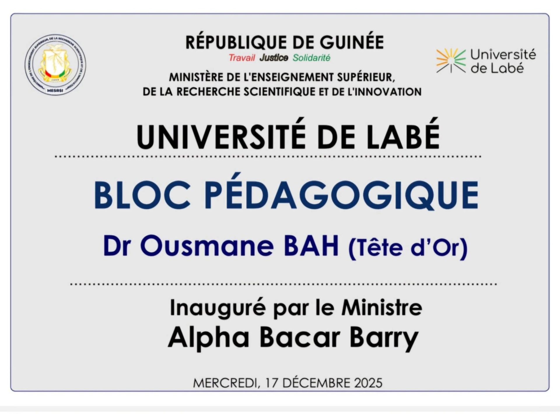 La famille de feu Ousmane Bah « Tête d’Or » renouvelle ses remerciements sincères à l’ensemble des autorités concernées pour ce geste mémoriel fort, qui inscrit à jamais le nom de cet illustre éducateur dans le patrimoine académique national.