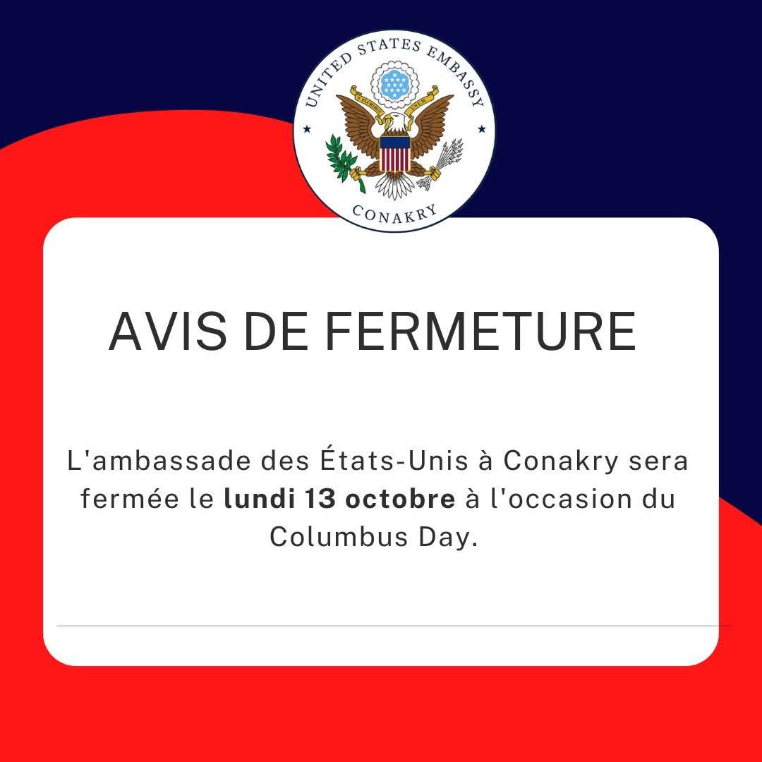 Conakry, le 10 octobre 2025 — L’Ambassade des États-Unis en République de Guinée a annoncé, dans un communiqué officiel, qu’elle sera fermée le lundi 13 octobre 2025 à l’occasion du Columbus Day, une fête nationale célébrée chaque deuxième lundi du mois d’octobre aux États-Unis.