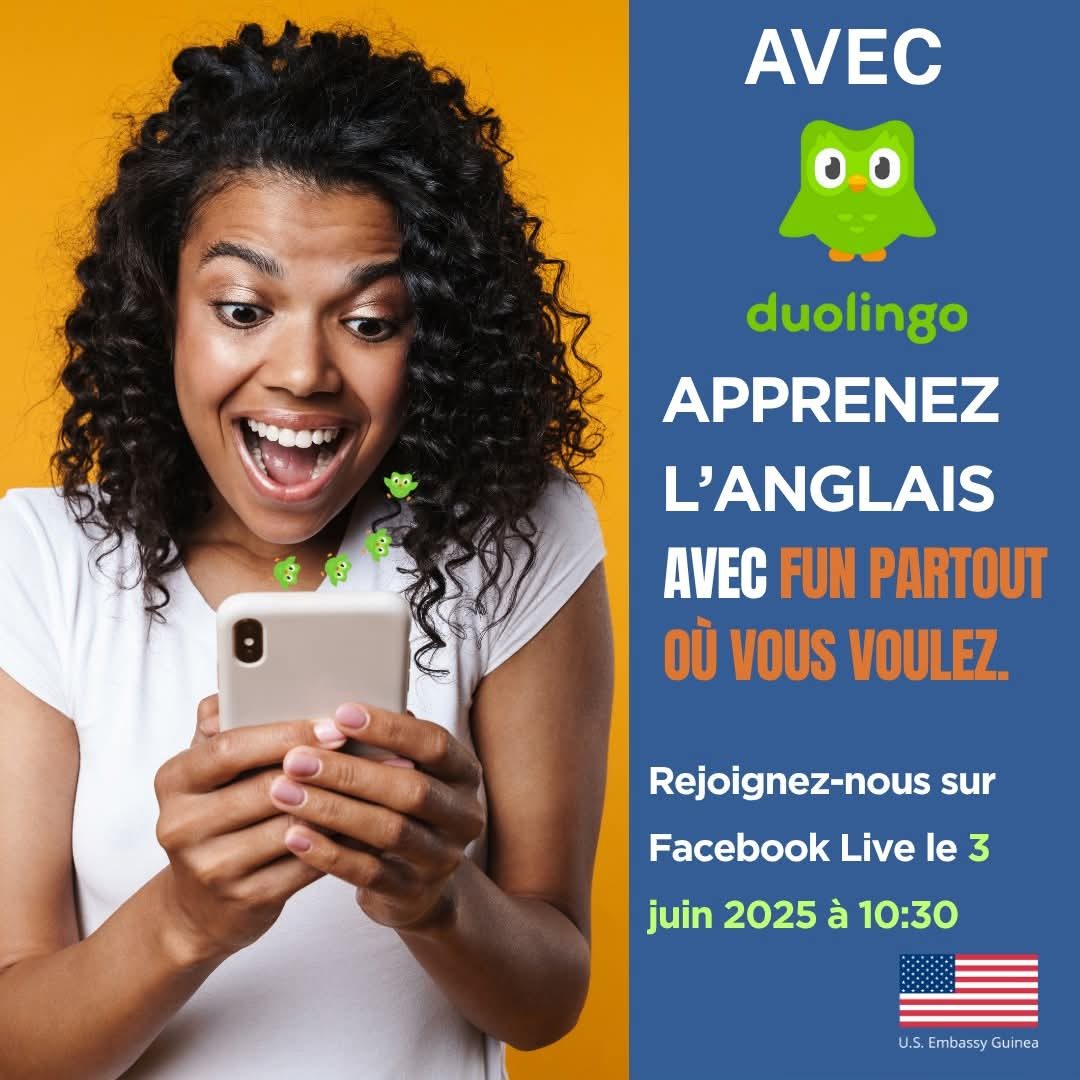 Conakry – Bonne nouvelle pour les apprenants guinéens : l’ambassade des États-Unis en Guinée vient de lancer un nouveau programme innovant d’apprentissage de l’anglais, en partenariat avec la célèbre application Duolingo. Cette initiative vise à rendre l’apprentissage de la langue anglaise plus accessible, ludique et flexible pour tous, à travers un outil numérique déjà utilisé dans le monde entier.