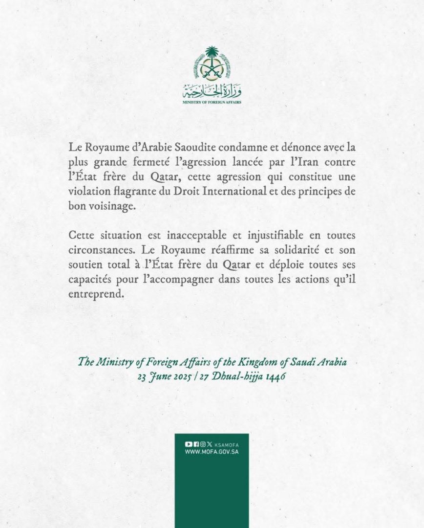 Riyad, le [date à insérer] — Dans un communiqué officiel, le Royaume d’Arabie Saoudite a exprimé sa vive condamnation à l’encontre de l’agression lancée par la République islamique d’Iran contre l’État du Qatar, qualifié de pays frère.