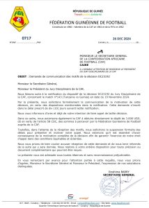 Dans un courrier adressé à la Confédération Africaine de Football, la FGF, par l’entremise de son secrétaire général, Ibrahima Barry demande clairement des explications à propos de cette décision d’une légèreté qui dépasse l’entendement. Elle sollicite formellement la motivation de cette décision, en vertu des dispositions mentionnées dans la notification. Selon elle, cette demande s’inscrit dans le délai prescrit de dix (10) jours, suivant ladite notification. Dans le même courrier, le secrétaire général informe la CAF de faire appel à ladite décision.