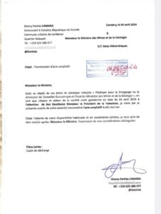 J’espère que vous allez bien ainsi que vos familles et autres proches collaborateurs. Je vous prie de bien vouloir trouver une copie de plaidoyer au président de la transition ainsi que l’acte ampliatif à son ministre des Mines et de la Géologie au sujet de M. Yakouba Kourouma, conseiller Économique et Fiscal dudit Département qui continue d’exercer sa fonction alors qu’une procédure judiciaire est ouverte contre lui et son chef hiérarchique d’alors, M. Moussa Magassouba pour des faits de corruption.