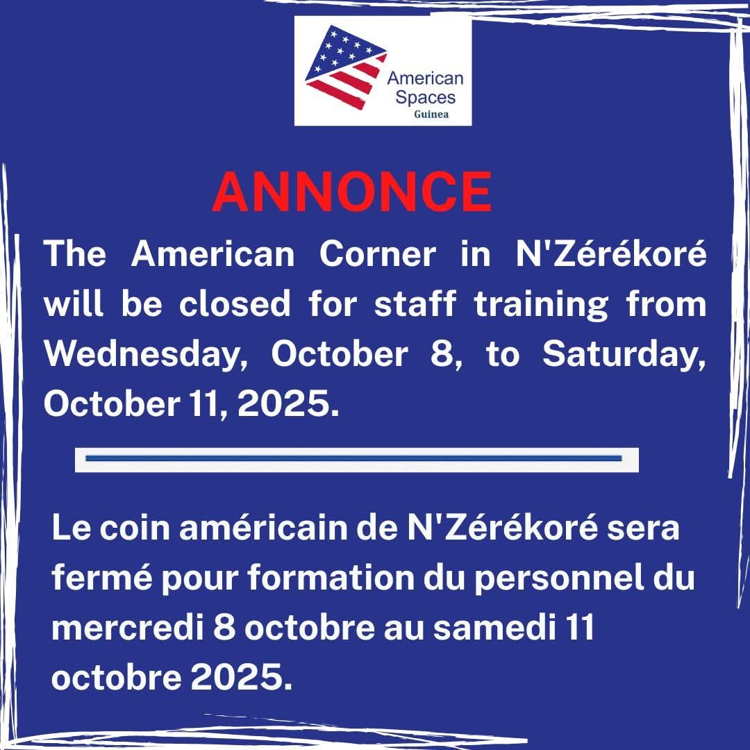 N’Zérékoré, le 7 octobre 2025 — Le Coin Américain (American Corner) de N’Zérékoré annonce une fermeture temporaire de ses activités du mercredi 8 au samedi 11 octobre 2025, en raison d’une session de formation dédiée à son personnel. Cette mesure vise à renforcer les compétences de l’équipe afin d’améliorer la qualité des services offerts aux usagers.