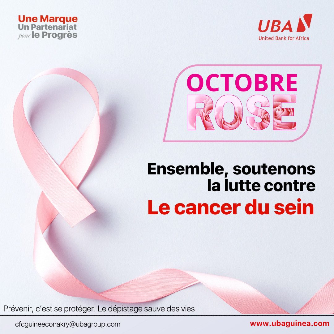 Conakry, 1er octobre 2025 — Comme partout dans le monde, la Guinée se joint à la campagne Octobre Rose, un mois consacré à la sensibilisation, au dépistage et à la lutte contre le cancer du sein. À cette occasion, UBA Guinée réaffirme son engagement à soutenir les femmes, les familles et toutes les personnes touchées par cette maladie.