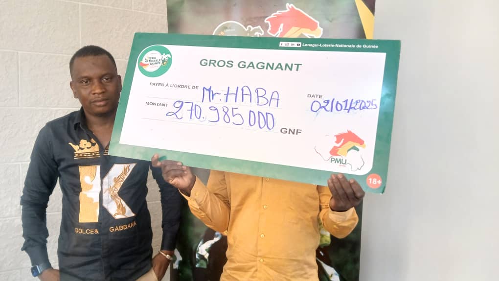 Le Pari Mutuel Urbain de Guinée (PMU), géré par la Loterie Nationale de Guinée (Lonagui), a couronné son premier grand gagnant de l’année 2025. Lors de la course du 2 janvier, Antoine Haba a décroché une somme impressionnante de 270 985 000 GNF. La remise officielle du chèque s’est déroulée ce jeudi, en présence du responsable de la communication de la Lonagui, Alain Youssouf Diabaté.