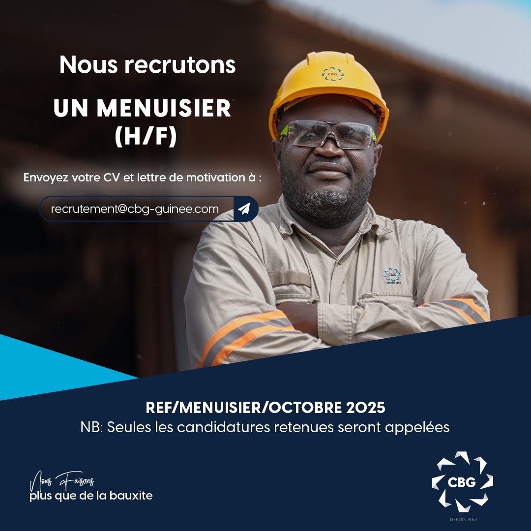 Dans le cadre de sa vision de croissance durable et inclusive, la Compagnie des Bauxites de Guinée (CBG) engage une série de recrutements stratégiques visant à renforcer son capital humain, notamment dans les domaines de la menuiserie et de la plomberie. Cette initiative traduit la volonté de l’entreprise d’investir dans les compétences locales et de promouvoir les métiers techniques essentiels à l’entretien et à l’amélioration de ses infrastructures.