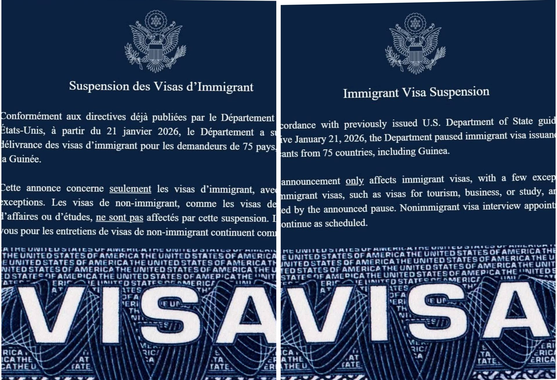 Le Département d’État des États-Unis a annoncé la suspension de la délivrance des visas d’immigrant pour les demandeurs originaires de 75 pays, dont la Guinée. Cette mesure est entrée en vigueur le 21 janvier 2026, conformément aux directives déjà publiées par les autorités américaines.