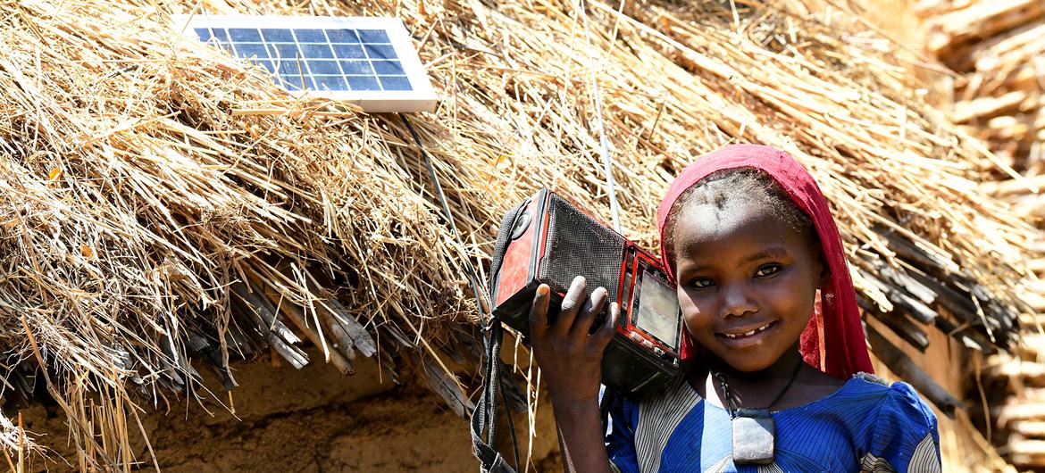 Dans la campagne tchadienne, une villagoise écoute un poste radio alimenté par un panneau photovoltaïque.solaire