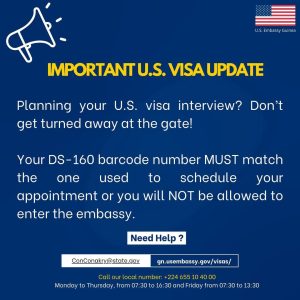 Conakry – L’ambassade des États-Unis en Guinée annonce une mise à jour importante concernant les demandes de visa. Désormais, tous les demandeurs devront impérativement présenter un formulaire DS-160 avec un code-barres correspondant à celui utilisé lors de la prise de rendez-vous. Tout écart entraînera un refus d’accès à l’ambassade.