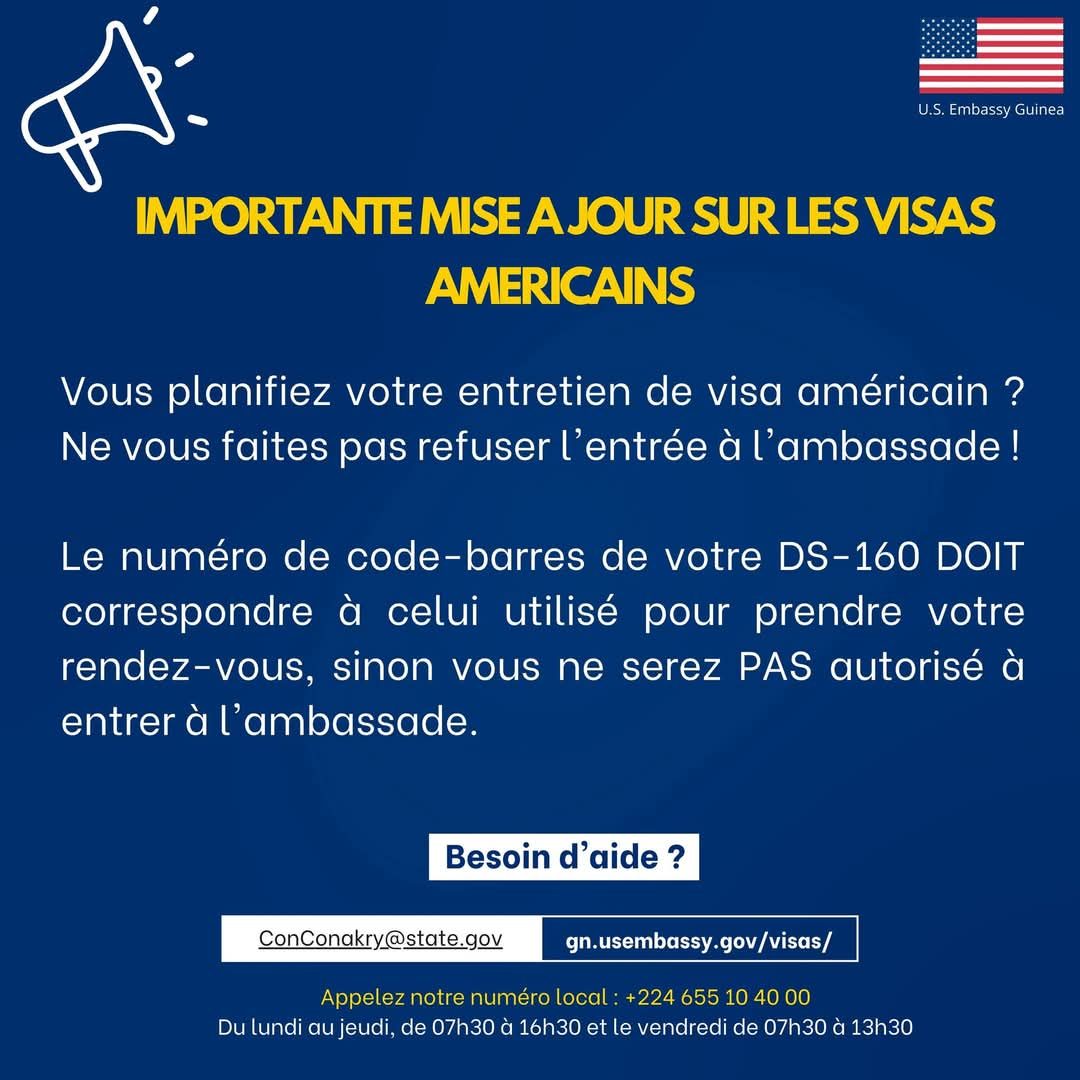Conakry – L’ambassade des États-Unis en Guinée annonce une mise à jour importante concernant les demandes de visa. Désormais, tous les demandeurs devront impérativement présenter un formulaire DS-160 avec un code-barres correspondant à celui utilisé lors de la prise de rendez-vous. Tout écart entraînera un refus d’accès à l’ambassade.
