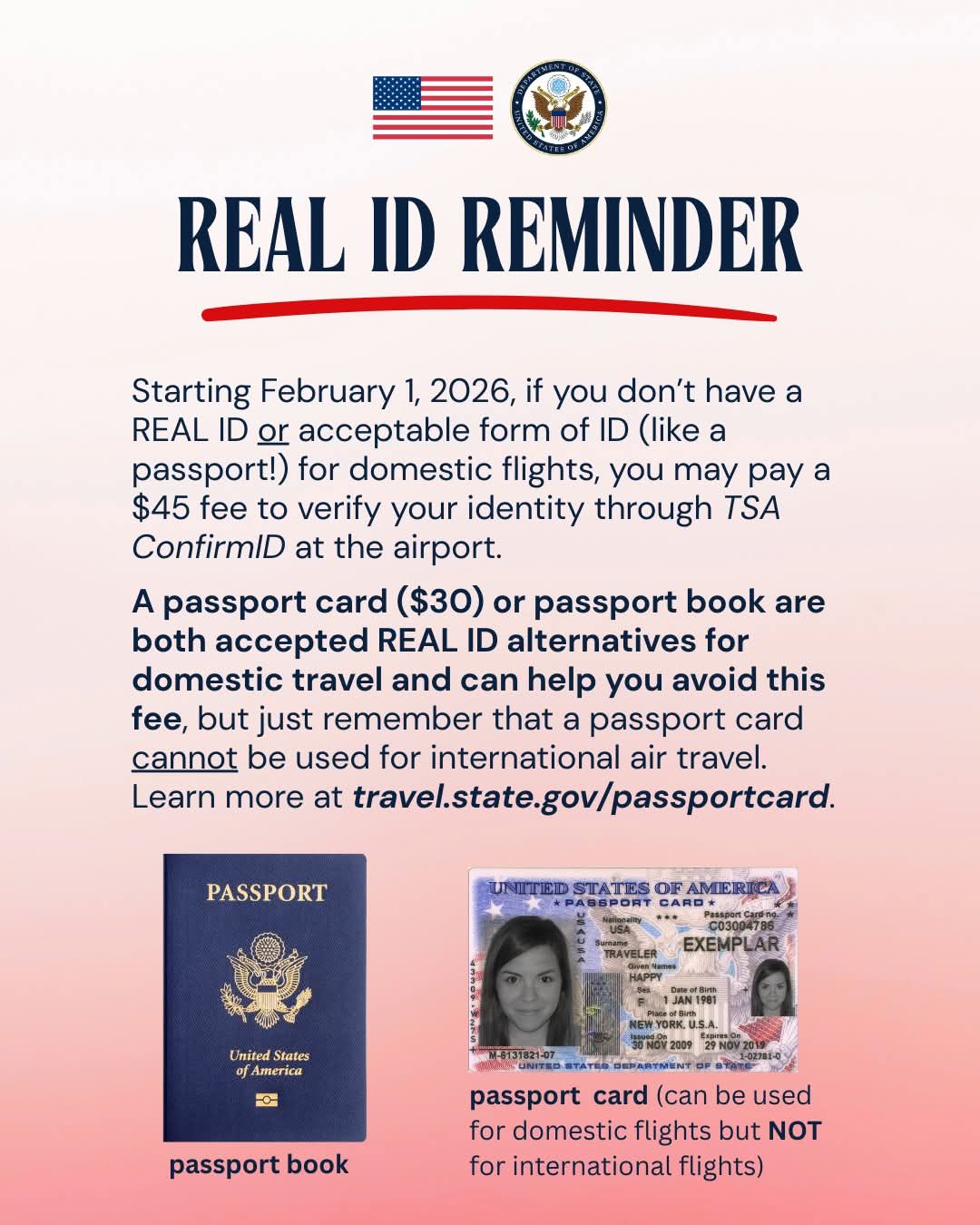 À partir du 1er février 2026, tous les passagers des vols intérieurs aux États-Unis devront présenter un REAL ID ou une pièce d’identité reconnue pour pouvoir embarquer. À défaut, ils pourraient être contraints de payer 45 $ pour faire vérifier leur identité via le service TSA ConfirmID.